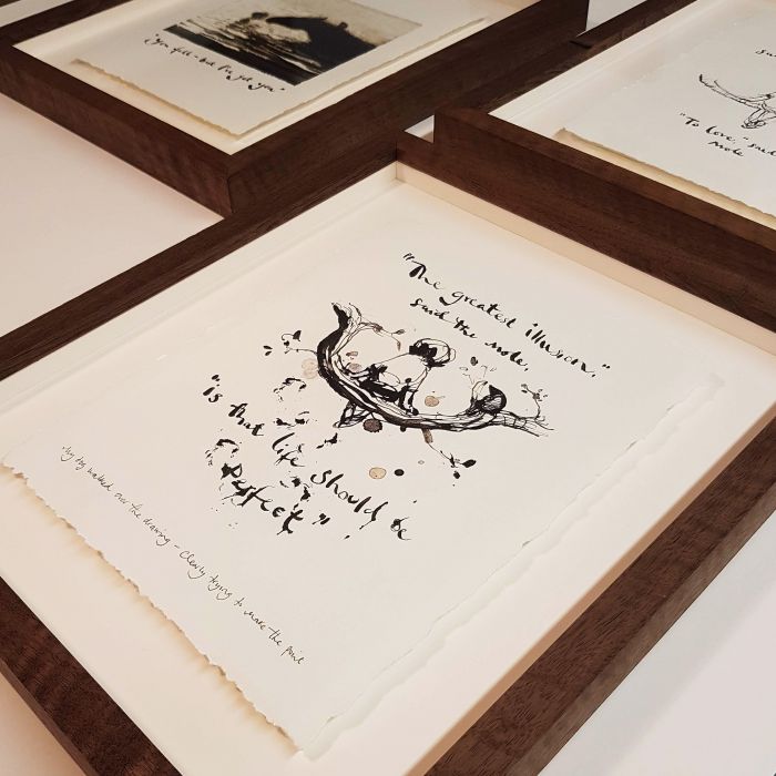 Une finition plus moderne de l'encadrement créant un écart entre le verre et l'œuvre d'art à l'aide d'entretoises qui ont la possibilité d'être laquées sur mesure pour compléter l’œuvre et l’option de cadre.
