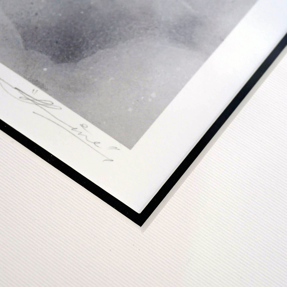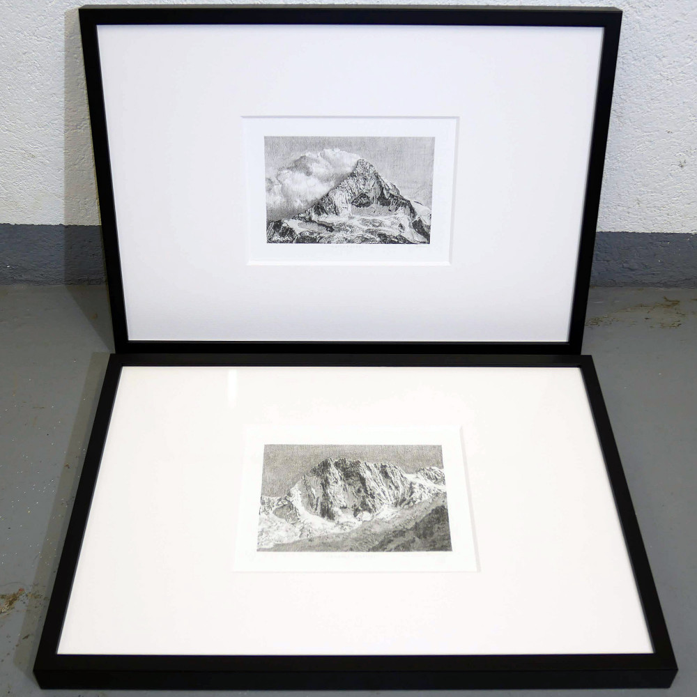 Graphite renderings in two matching frames with 3mm deep mounts and anti-reflective glass.
