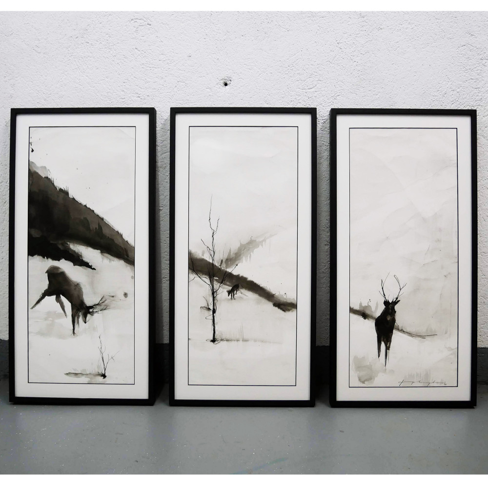Triptych of original artwork with single black-core mount in custom laquered natural wood frames.
