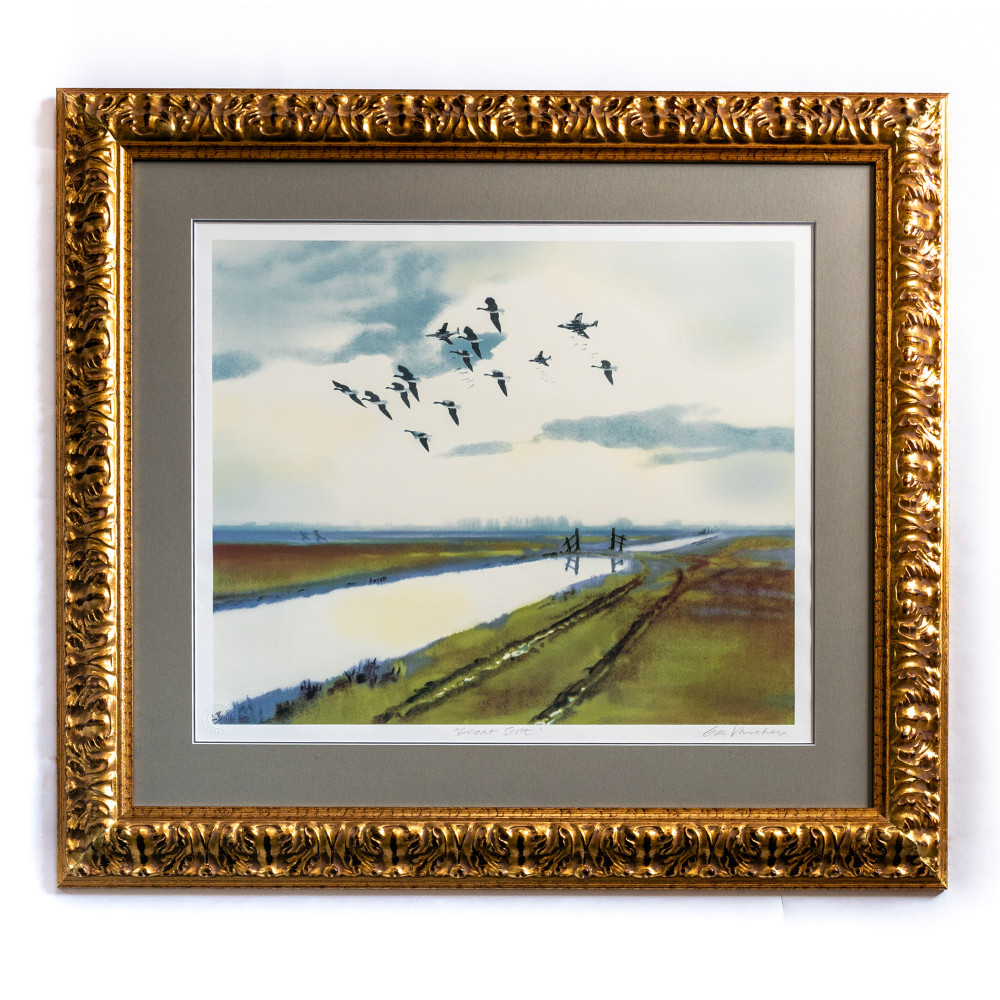 Gee Vaucher screenprint with ornate gild frame, double mount and anti-reflective glass.